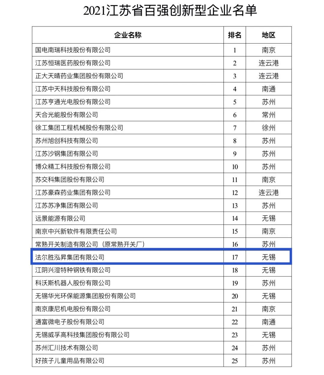 “2021江苏省百强创新型企业”榜单!